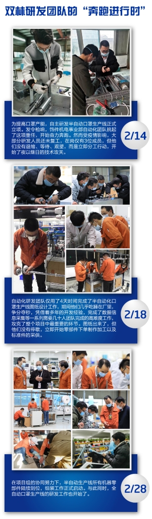虽然前期无相关资源积累,可是项目组在认真人邬建成的向导下依附着富厚的履历、专业的手艺素养、敢闯敢拼的尊龙凯时品质,经由不懈奋战与起劲,终于攻克下了一个个手艺壁垒,完成了半自动口罩生产线的设计、制造、组装、调试、投产,这是一项主要的突破,意味着公司在口罩生产领域实现了往上游延伸,工业链越发完善,具备了口罩装备制造的焦点能力。下一步,项目组将把耳线焊接等工艺加入到产线,进一步提升产线自动化水平,逐步镌汰手动生产,以大幅提升口罩生产效率和产品质量。
